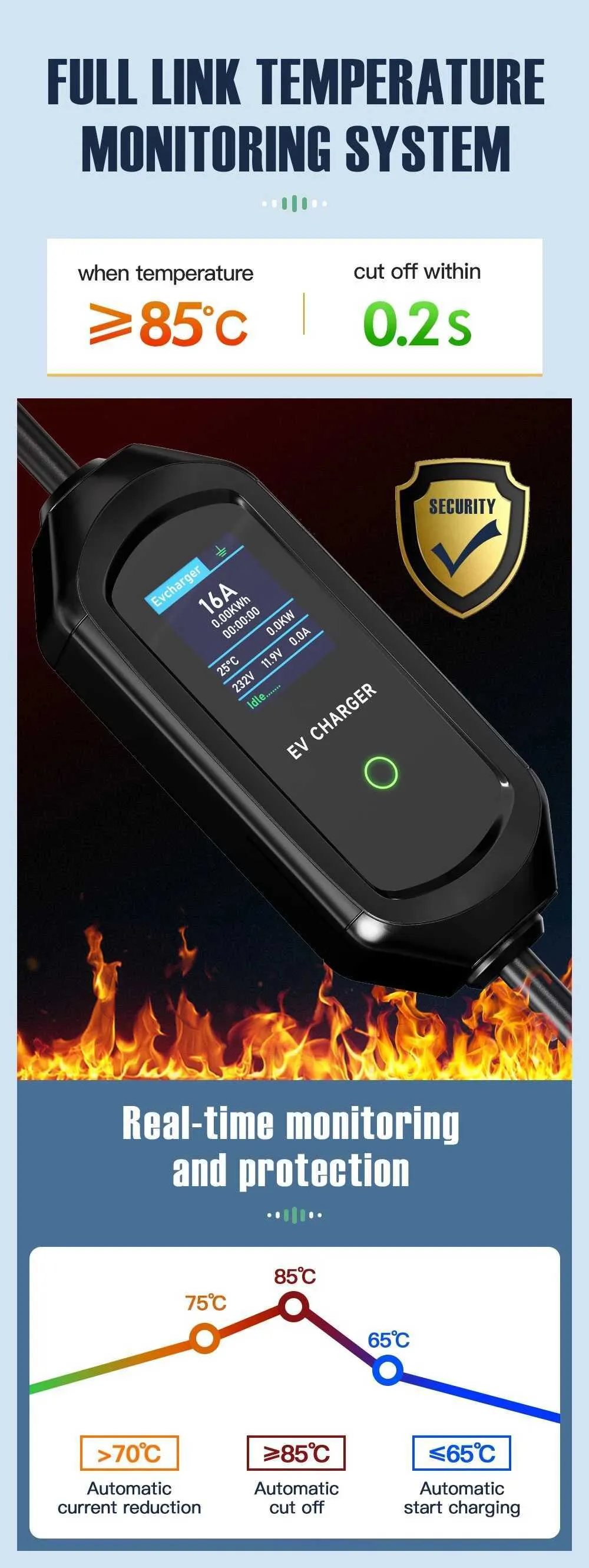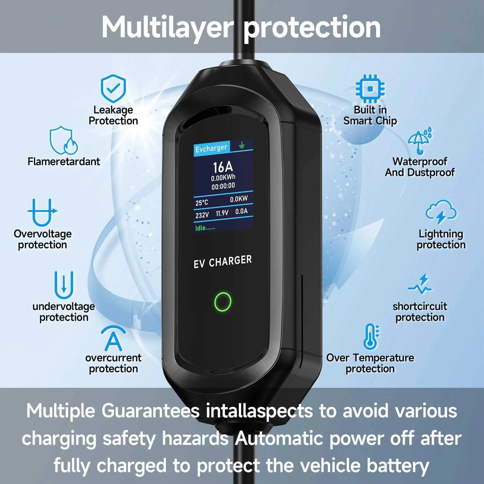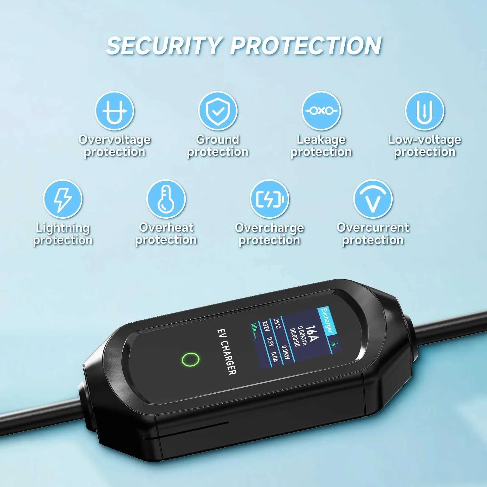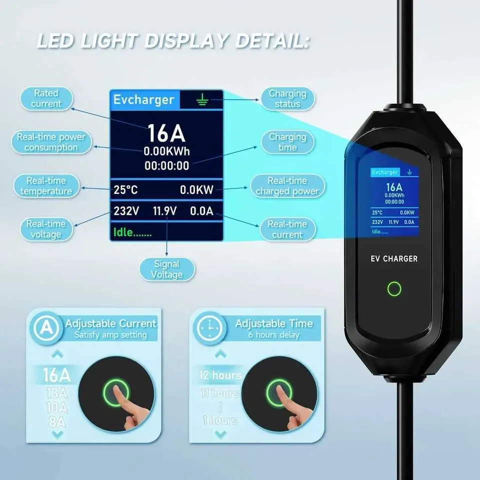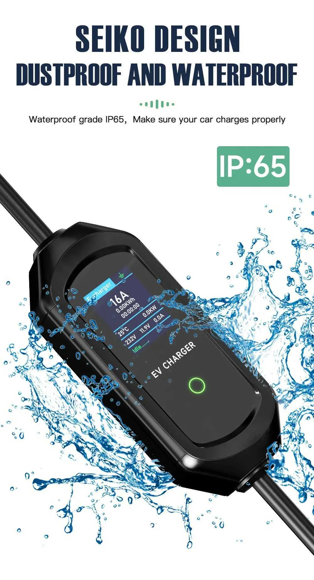 IP Rating: IP65 Cable Length: 10m Voltage: 110V~250V Operation Temperature: -30 C~+65 C Material: ABS+PC Color: Black Size: 23x9.5x5.5cm Category: Electric Vehicle Charger..