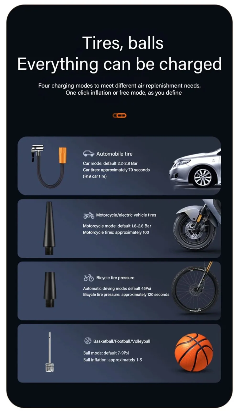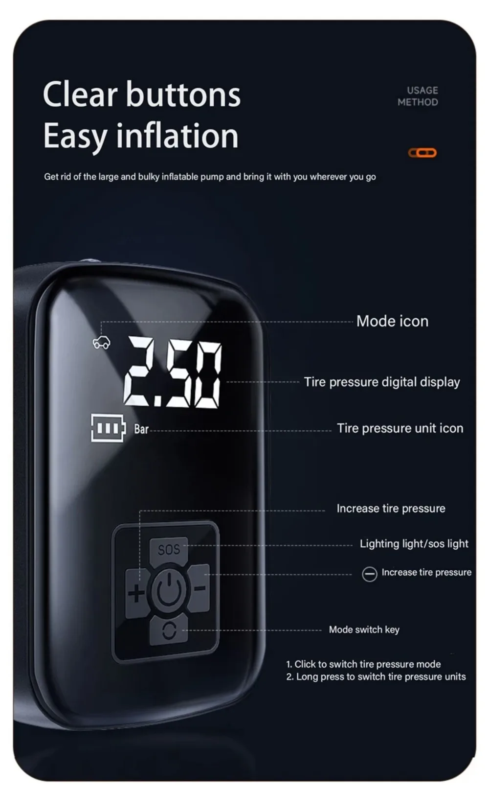 Working Voltage: 12Vm/7.4v/2A Air Pressure: 150 PSI Item Weight: 0.45kg Tracheal Length:15cm Color: Black Size: 13x4.5x9.5cm Material: ABS Category: Inflatable Pum..